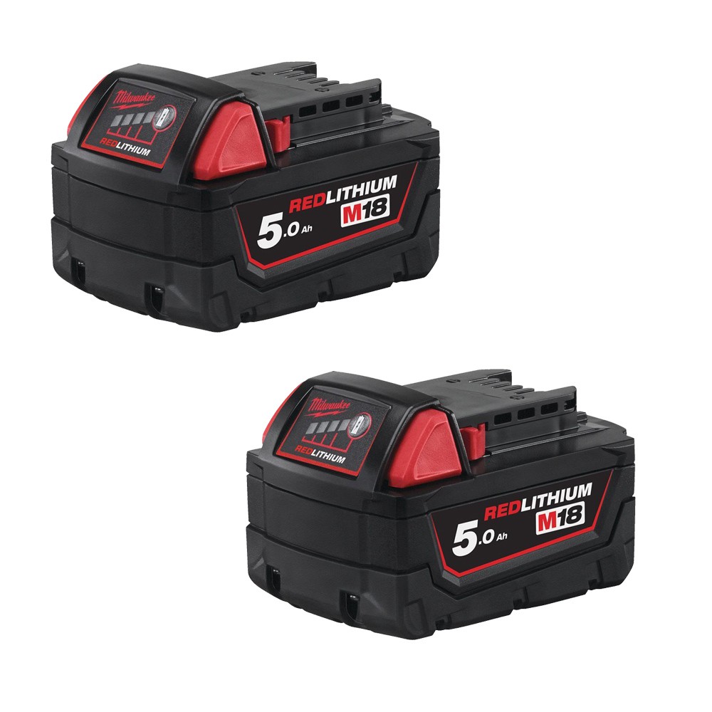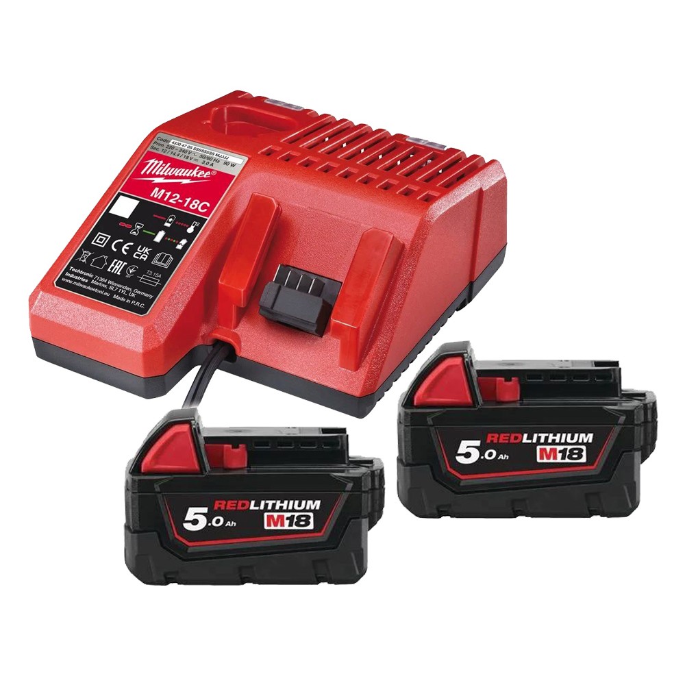 Le pack NRG-502C Milwaukee comprend deux batteries 18V 5.0Ah M18 B5 ainsi qu’un chargeur universel multi-voltage M12-18C, capable de recharger les accumulateurs RedLithium-Ion compatibles avec les systèmes M12 à M18.